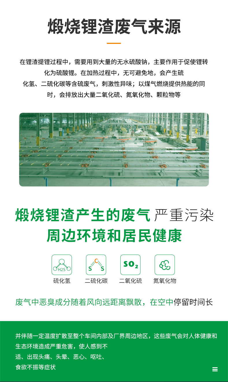 在鋰渣提鋰過程中,需要用到大量的無水硫酸鈉,主要作用于促使鋰轉化為硫酸鋰。在加熱過程中,無可避免地,會產生硫化氫、二硫化碳等含硫廢氣,刺激性異味大;
